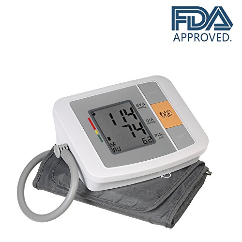 -. Feature : Authority Certification:FDA approved arm blood pressure monitor. Intelligent auto cuff inflation and deflation, measures systolic, diastolic and pulse at the same time. / Accurate and Reliable:Designed for two users with easy access buttons, 90 sets of reading storage for each one. And automatically displays the average of your last 3 readings taken. / Intelligent : An alert symbol will be displayed along with the reading if the irregular heartbeat is detected during the measurement. Blood pressure classification (WHO) indicator fully shows your blood pressure situation. / Simple and Convenient: Easy one-press operation, Supports batteries and power adapter (batteries and power adapter not included).The cuff fits standard and large adult arm circumferences from (22-32) cm. / Quality Assurance: Now, Every country has a large population of elderly people, for each family, you need to have a blood pressure meter to always monitor your health, It's a good choice to give mom and Dad, grandparents, one year free warranty.