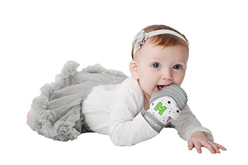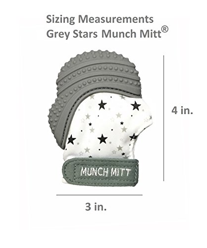 -. Feature : HANDS ALWAYS IN TEETHING BABY'S MOUTH? This mitt from the Specialty Collection is the perfect solution! Give mom and dad the satisfaction of knowing they are doing the right thing by using this Munch Mitt® to keep teething baby safe from scratching themselves, saliva irritating their skin, and lessen the chance of developing blisters from thumb sucking. / BABY ENTERTAINS SELF WITH A SENSORY STIMULATING TOY. The crinkle sound, pain relieving texture, and black, white & grey contrasting colors will stimulate learning to help your baby reach their developmental milestones sooner. Because baby entertains themselves mom has time to finish a meal, call a friend, or even take a shower. And we know, after mom sees how much her baby loves this mitt she will definitely need a minute to get on the phone to tell a friend about this new Specialty Collection. / HELPS FUSSY, CRYING BABIES BY REDUCING PAIN FROM TEETHING. This chemical free, baby safe, all natural convenient approach to pain relief caused by teething will transform a fussy baby to a smiling baby in no time and make parents feel good that they are helping their baby feel better. Plus, with the additional color choices in this Specialty Collection moms can choose just the right color for her new happy pain free baby. / CONSTANTLY PICKING TOYS UP OFF THE GROUND AND CHANGING DROOL SOAKED CLOTHES? The Munch Mitt® comes with an adjustable Velcro strap to prevent baby from dropping it on the ground and soft breathable fabric that absorbs drool so you spend less money and time doing laundry. Moms love that the mitts are machine washable, super easy to clean and each one comes with a complimentary travel/laundry bag. / SAFE FOR BABY AND MADE TO LAST FOR YEARS. Click the add to cart button now to receive Baby Maternity Magazine's top choice, award winning self-soothing teething toy that is proven to entertain baby, encourages learning, is so well made it can be passed down to younger siblings, thus saving you money. It is made with food grade silicone and BPA and phthalate-free. That's right, press the add to cart button now to be one of the first moms to get a mitt from this exclusive Specialty Collection!