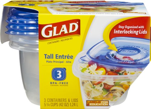 GladWare Tall Entree Containers offer a convenient mechanism for packing on-the-go meals and storing leftovers. Made from BPA-free materials, these durable containers help keep food fresh and are microwave, dishwasher, and freezer safe. Designed with interlocking lids, they stack neatly in your cupboard to reduce clutter.