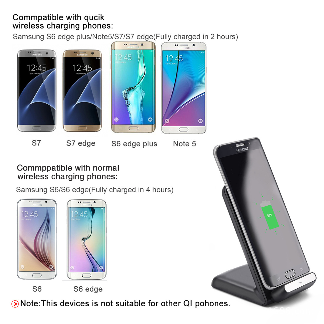 Note: 1.This product Only Support For Samsung S6/S6 edge/Note5/S7/S7 edge, Does not support other mobile phone wireless charging.
