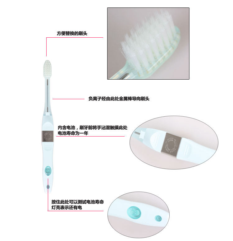 ●用負離子的力量有效去除齒垢---金屬內藏 3V 鋰電池,離子功效絕佳。只要使用 3 分鐘,牙齒光滑乾淨