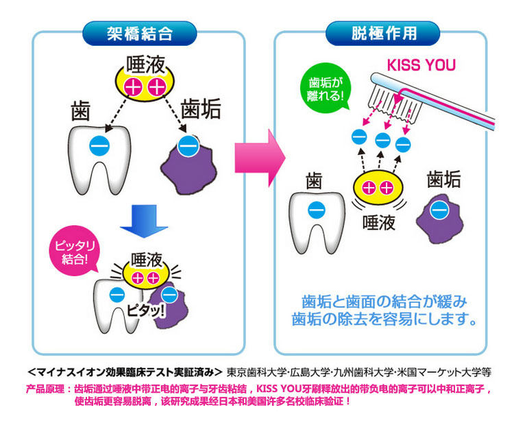 齒垢(-)利用口水中的鈣(++)而附著於牙齒表面(-),使用負離子牙刷可以產生負離子破除「電」的平衡狀態,輕輕鬆鬆就可以清除齒垢。人體結構原本就會產生電,利用內藏電池的牙刷刷牙,負離子就會流向口腔,促使齒垢脫離牙齒表面。