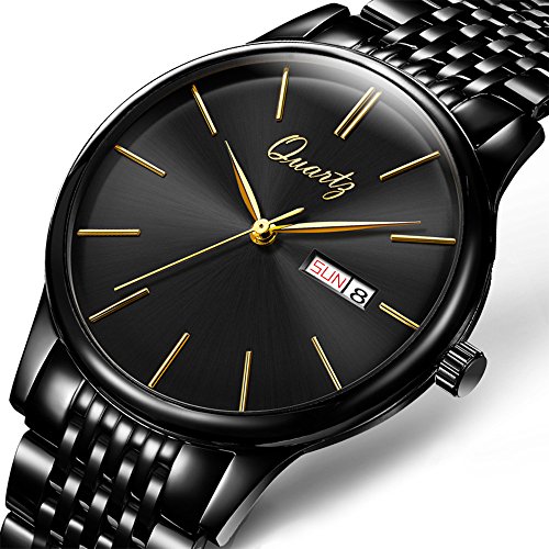 -. Feature : High quality quartz movement with analog display,keep precise time / Elegant ultra thin dial design with featuring auto date. Classic, fashion, minimalist style, slim black stainless steel case, prefect suitable for every occasion (outdoor, business, party), also a great gift for family and friends. / Mineral glass: Clean smooth glass, scratch-resistant, wear-resistance. Fold clasps, easy to use and comfortable. / Big Face: Case diameter: 40 mm, Case thickness: 9mm, Band Width: 20mm, will include a free remover tool for adjust the metal links. / Water resistant to 100 feet (30 M),Withstands rain and splashes of water.