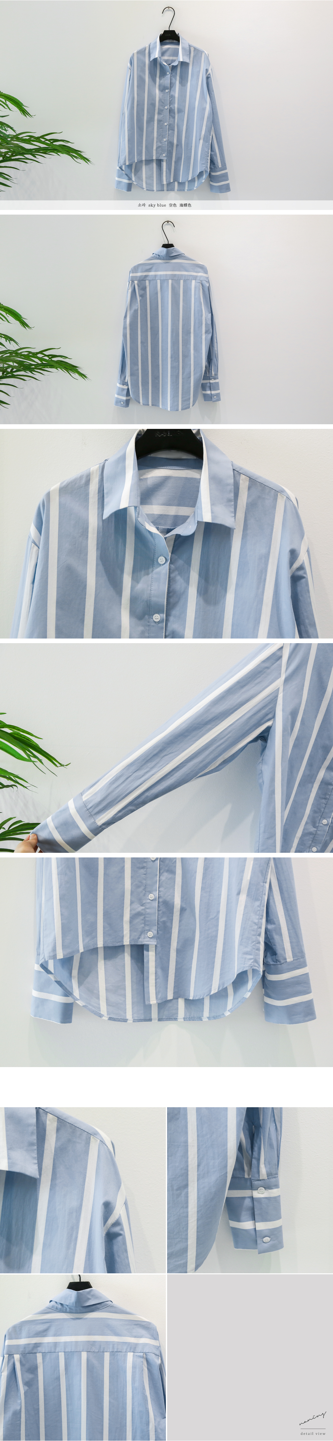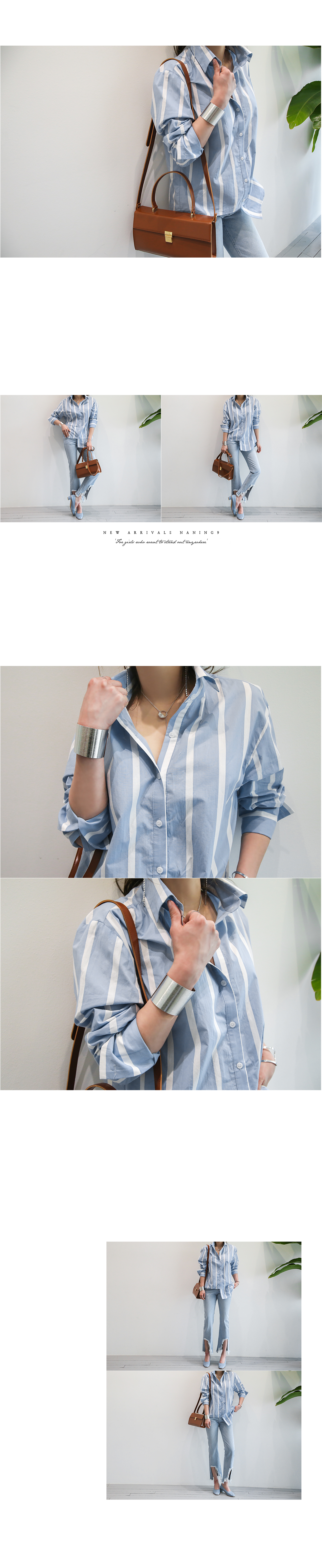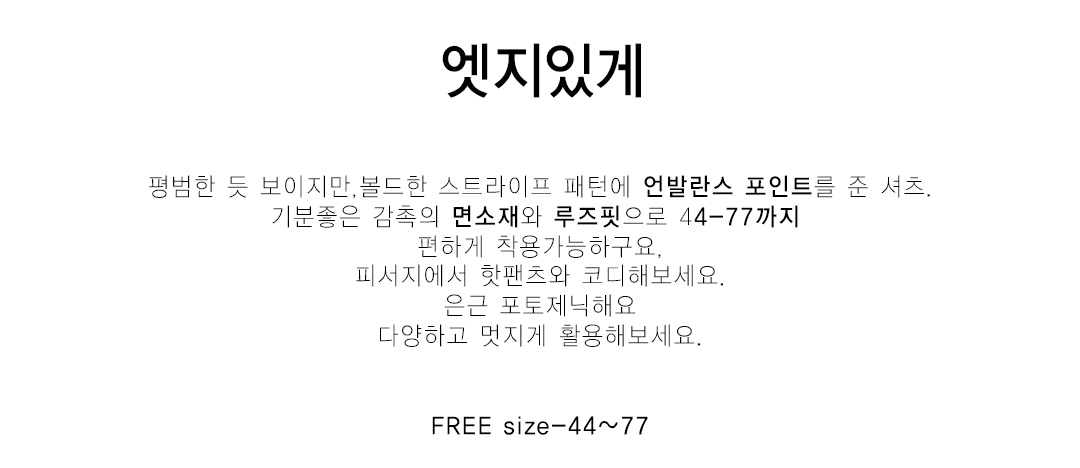 유니크한 디자인의 셔츠 소개해드릴께요.베이직한 셔츠 기본디자인에 스트라이프 패턴으로 포인트 준 제품인데요.소매부분 와이드한 커프스가 은근히 여성스럽습니다.면100% 소재로 부드러운 착용감을 느끼실 수 있으며적당히 넉넉한 품으로 편안하고 여유롭게 착용이 가능해요~밑단기장이 언발란스해 좀더 멋스러우며바지안에 넣어입어도 꺼내입어도 잘어울린답니다.유행타지 않는 디자인으로 하나쯤 소장하시면 스타일링이 간편해요!