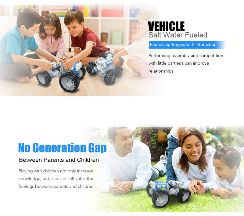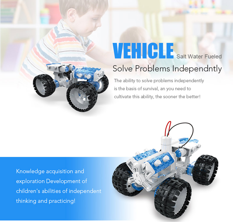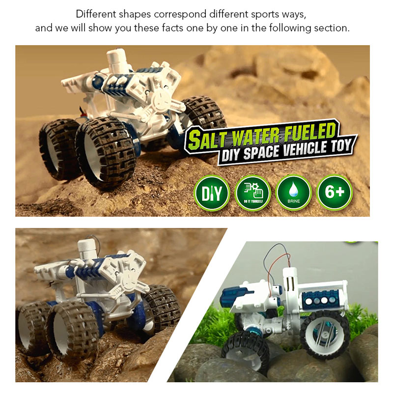 A vehicle that adopts alternative energy cell can be assembled with the whole set of components. It's a new way to teach children new, clean energy. Just add couple of salt water drips in the engine and the space vehicle will be started, as if by magic! And there are other things waiting for you to explore. Knowledge acquisition, exploration, innovation, and development of children's abilities of independent thinking and practicing! Features: Light and safe plastic easy take for kids; science, environmental protection. Just need salt water as the power; green salt water power is more safe for kids. DIY blocks assembly experience, abandon the traditional boring education way, and cultivate a sense of self-success and learning interest. Understand the principle of mechanical movement, learn the process of its transformation into power, and develop children's hands-on ability and interest in science and technology. Performing assembly and competition with little partners can improve relationship. Playing with children not only increases knowledge, but also cultivates the feelings between parents and children.