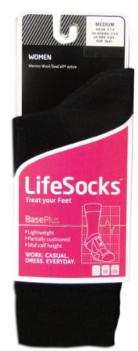 -. Feature : Designed for women's feet with a lightweight and tailored style, this versatile, lightweight sock has been designed for superior comfort and protection. Perfect for casual and day-to-day wear, the Lifesocks BasePlus is the ultimate all-year-round sock / High-stretch cuff and trademarked Elastic Support System (ESS) ensures low compression promoting circulation and a sock that won't bunch or ride down / Soft merino wool knitted to the inside for superior softness and comfort. Superior insulation properties of merino wool keep the foot warm in winter and at an even comfortable temperature in warmer climates. Merino keeps feet drier by drawing and holding moisture away from the foot / Seacell Active, a bioactive innovative cellulose seaweed and silver-based fiber, keeps feet supple and promotes optimal health / Strategically placed cushioning throughout and a system of flex panels and ergonomic channels promotes correct positioning, protection and comfort. Double cuff with high stretch allows blood to flow more freely through the lower leg and into the foot