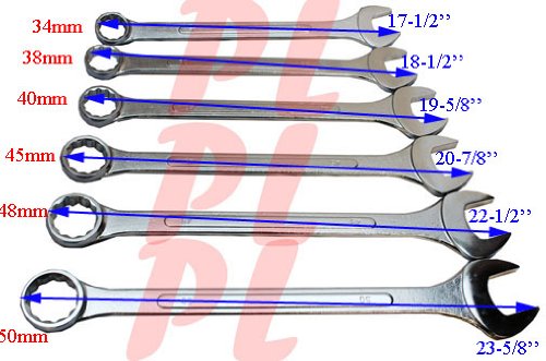 - Feature : 6 Pc jumbo combination wrench set; Heavy duty / Heat treated and chrome plated; Drop forged carbon steel / Precision machined 15 degree open and 12-point box end / Size: 34mm, 38mm, 40mm, 45mm, 48mm, and 50mm; Length: 17-1/2'' (shortest), 23-5/8'' (longest) / Quantity: 1 set (6 pieces); Weight: 19.30 lbs (all 6 total)