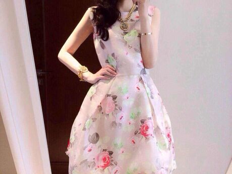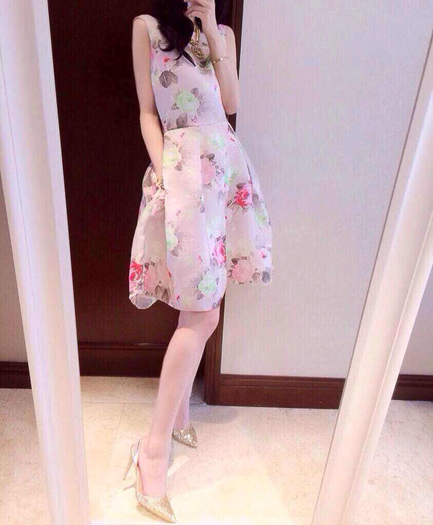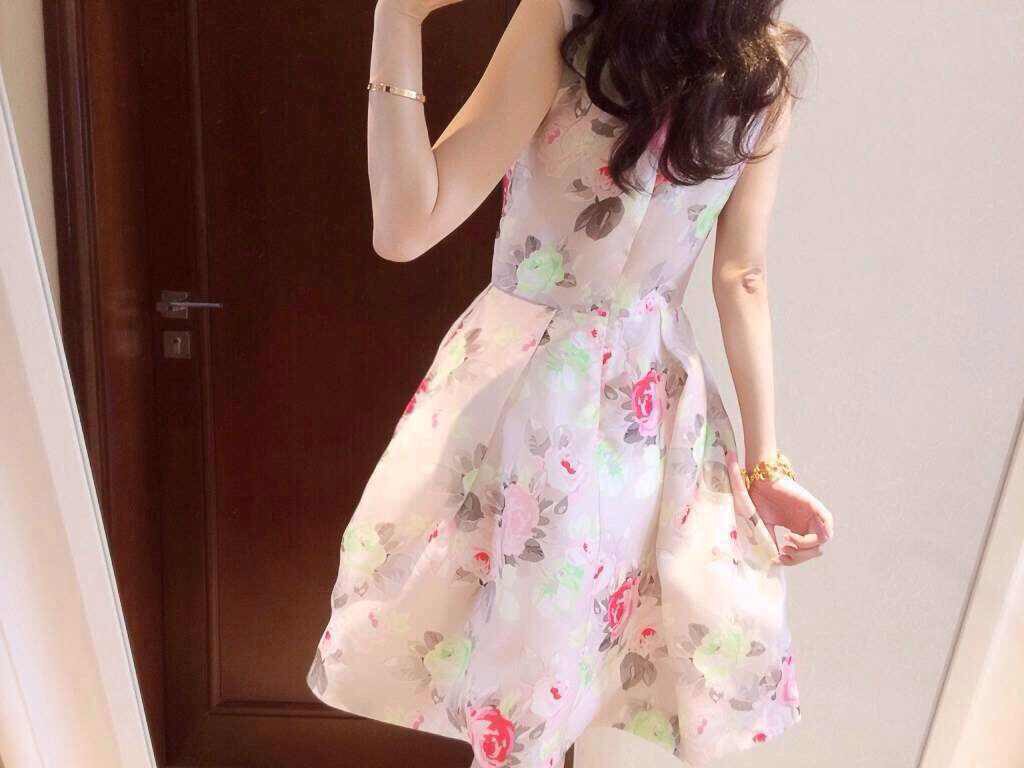 春夏季无袖雪纺连衣裙蓬蓬裙女显瘦修身印花小清新打底裙子