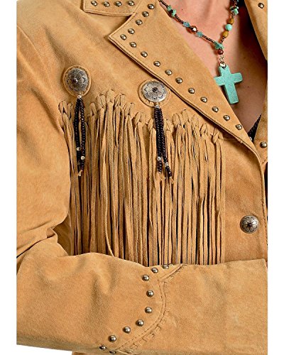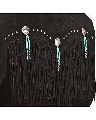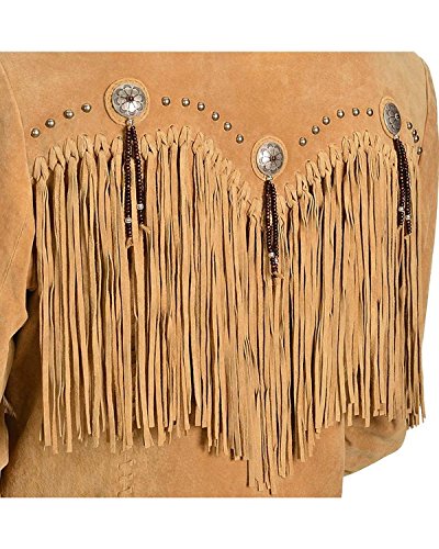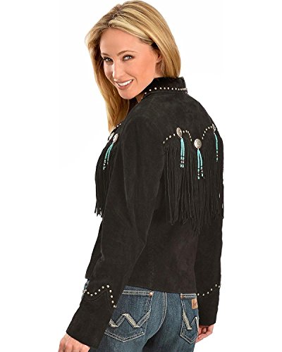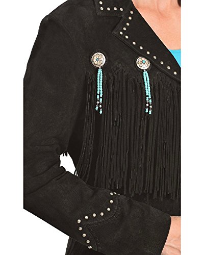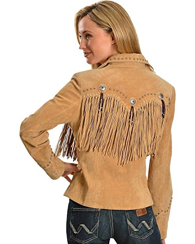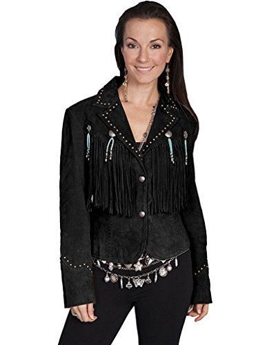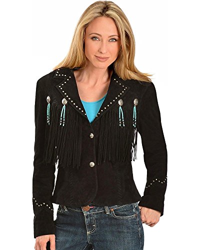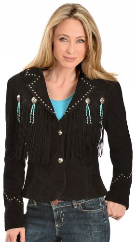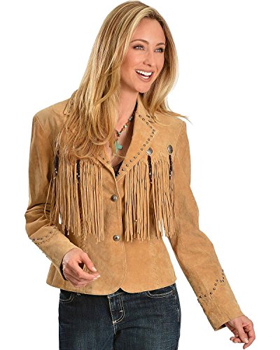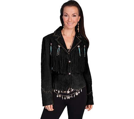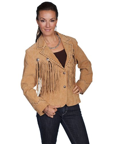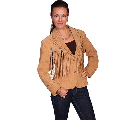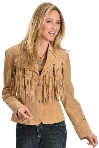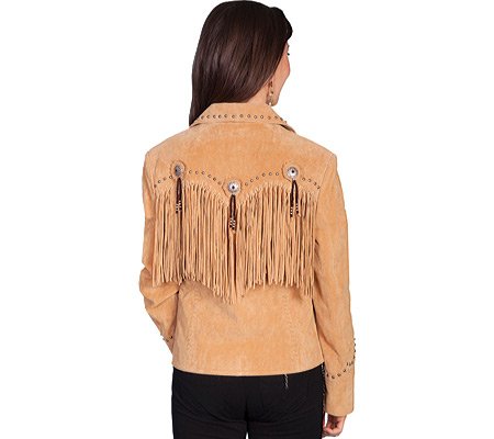 Studio : Scully Publisher : Scully Binding : Apparel Product Description Enjoy your own premium Scully Leather jacket from the leather craftsmen who produced leather jackets, gloves and helmets for WWI and WWII pilots and Admiral Byrd's expedition to the Antarctic Scully Leather Company has been crafting fine leather wear since 1906, some of which you'll find on display in the likes of the Smithsonian Institute and the Museum of Flight in Seattle, Washington. Scully leather wear is handcrafted from grade "A" leathers, with special consideration given to surface character and softness of hand. Scully is leather wear you can be proud to own Our Scully supple leather jacket adds instant western sophistication to any cowgirl's attire This western leather fringe jacket boasts quality craftsmanship with suede leather, drenched in fringe and finished with silver-tone medallion details on front and back. Silver-tone, medallion concho snap closures feature decorative center bead and floral etching. 100% acetate satin lining. This women's fringed leather jacket back length (from collar to hem) measures 24". Sizes: S(4-6), M(8-10), L(12-14), XL(16), 2XL(20). Imported. 0
