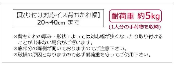 | 仕様 | 耐荷重:約5kg 収納目安:1人分 取付け対応イス背もたれ幅:20~40cm |