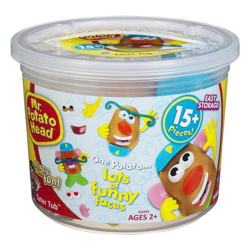 Set includes 1 potato body, feet, 4 pairs of eyes, nose, 2 ears, 3 mouths, tongue, baseball cap, 2 arms, mustache and storage bucket with lid