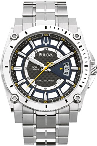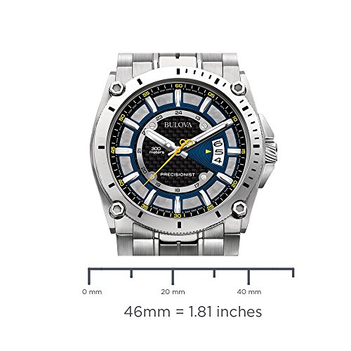 -. Binding : Watch -. Brand : Bulova -. ClothingSize : CASE 46.5MM -. Color : black -. Department : men -. EAN : 0042429465022 -. Feature : Due to a recent redesign by Bulova, recently manufactured Bulova watches, including all watches sold and shipped by Amazon, will not feature the Bulova tuning fork logo on the watch face. / Precisionist, one of the world's most accurate movements - accurate to within seconds a year / Stainless steel case and bracelet / Continuously sweeping second hand / Water resistant to 990 feet (300 M):suitable for scuba diving to a depth of 30 meters for up to 2 hours -. Label : Bulova -. Manufacturer : Bulova -. Model : 96B131 -. MPN : 96B131 -. NumberOfItems : 1 -. PackageQuantity : 1 -. PartNumber : 96B131 -. ProductGroup : Watch -. ProductTypeName : WATCH -. Publisher : Bulova -. ReleaseDate : 2013-07-28 -. Size : CASE 46.5MM -. Studio : Bulova -. Title : Bulova Men's 96B131 Precisionist Black Dial Steel Bracelet Watch -. UPC : 424294650220