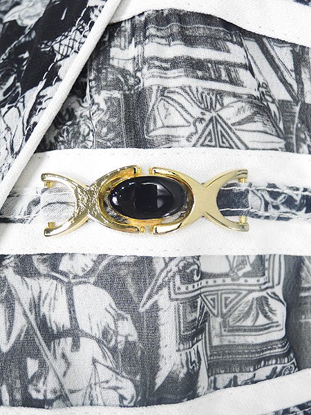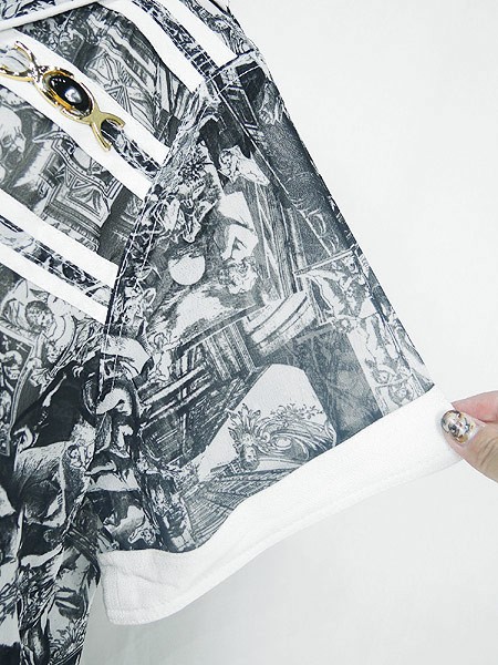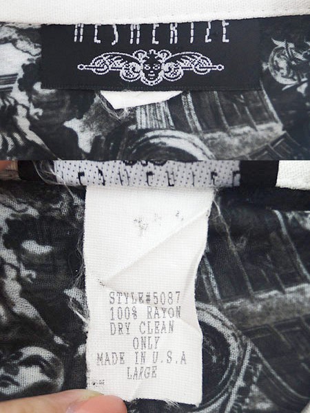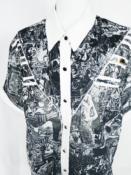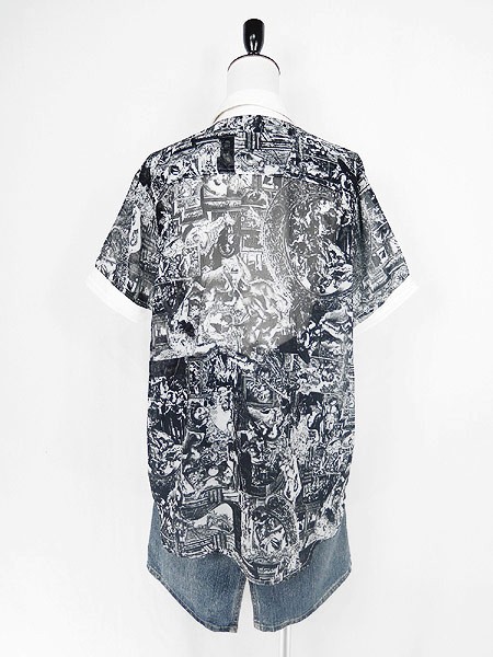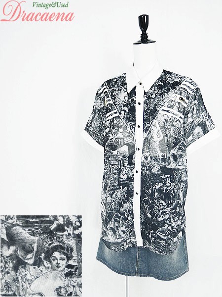 Ladies ブランド- カラー黒ベース メール便不可 コンディション★★★ 素材レーヨン 表記サイズL スタッフコメント一番下ボタン、前立裏にヨゴレあり。透け感あり。 実寸サイズ 着丈 73 cm 身幅 58 cm 肩幅 43 cm 袖丈 22 cm ※ウエスト・ヒップ以外は平置き採寸