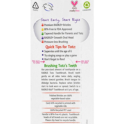 -. Binding : Health and Beauty -. Brand : RADIUS -. EAN : 8592720398007 -. Feature : Vendor: Radius / Item: Radius Totz Toothbrush 18+ Months - Extra Soft - Clear Sparkle - Case of 6 / For: Oral Care / Item UPC No: 85178001097 -. Label : U-Nutra -. LegalDisclaimer : PLEASE NOTE: Product image is representative of the product offered but may not have the exact attributes. Please read product description for the specific attributes of this product. The information above is intended for reference only. While we attempt to keep our information accurate, we cannot guarantee it is an accurate representation of the latest formulation of the product. If you have any concerns, please visit the vendor's web site. The information above are the views of the product's manufacturer. These statements have not been evaluated by the Food and Drug Administration. This product is not intended to diagnose, treat, cure or prevent any disease. -. Manufacturer : U-Nutra -. MPN : 0176511 -. PartNumber : 0176511 -. ProductGroup : Health and Beauty -. ProductTypeName : HEALTH_PERSONAL_CARE -. Publisher : U-Nutra -. Studio : U-Nutra -. Title : Radius Totz Toothbrush 18+ Months - Extra Soft - Clear Sparkle - Case of 6
