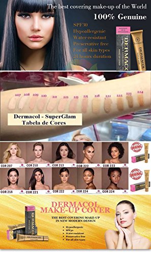 -. Feature : DERMACOL MAKE-UP COVER provides PERFECT COVERAGE even in thin layers and is the perfect corrector for dark under-eye, unpleasant spots and skin blemishes. It completely covers acne, loss of pigmentation, post surgical bruising, tattoos etc. It may be used on the entire face or body for color correction, darkening or lightening the skin tones, and ensuring ideal balance. / Legendary high covering make-up BENEFITS : Waterproof Hypoallergenic For all skin types SPF 30 Preservative free / COVERAGE : Full (extreme) The clinically tested, extreme covering Make up Cover was created as the first of its kind in Europe and one of the first in the world. The license for this foundation was eventually sold to Hollywood. It contains 50% pigments, which makes it a weapon against skin imperfections. / Dermacol Make-up Cover - Acne Get rid of acne! Dermacol Make-up Cover - Tattoo Are you preparing for a meeting and need to hide your tattoo? Don't be nervous and use Make-up Cover. Dermacol Make-up Cover - Dark circles under the eyes Dark circles under the eyes, loss of pigmentations and other skin problems...forget it and use Make-up Cover. / How to use Chose the best color shade for your skin. Gently tap the makup onto your skin with either your fingers or with a damped make-up sponge. Apply Dermacol Foundation gradually by first using a small quantity and then add as needed until all skin problems are covered.
