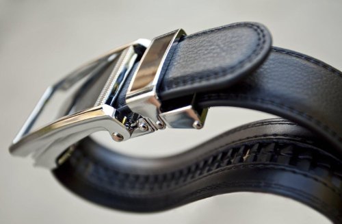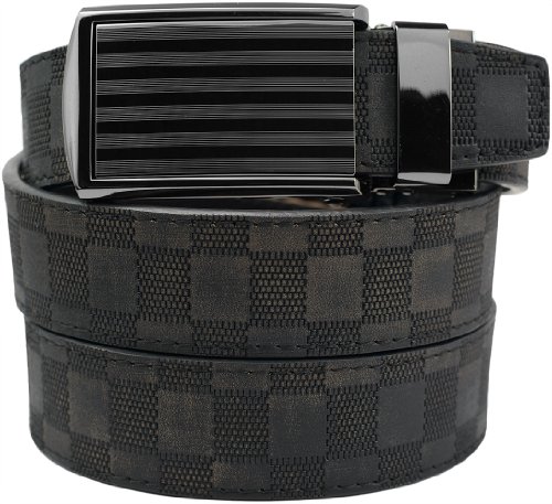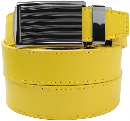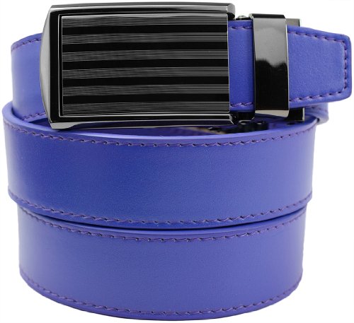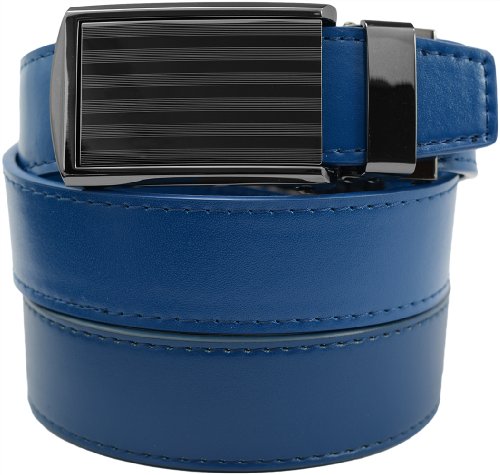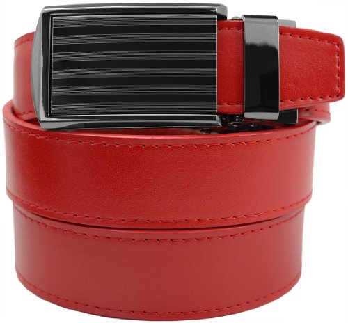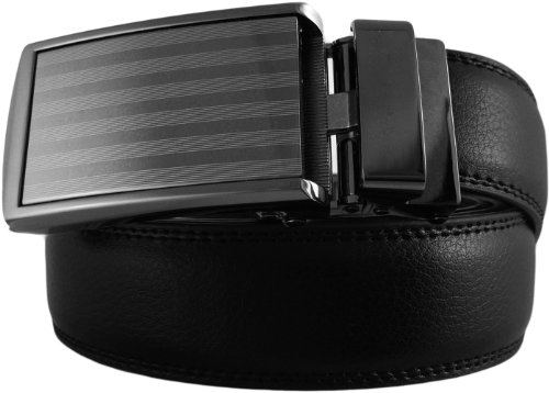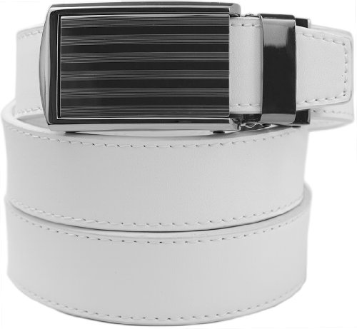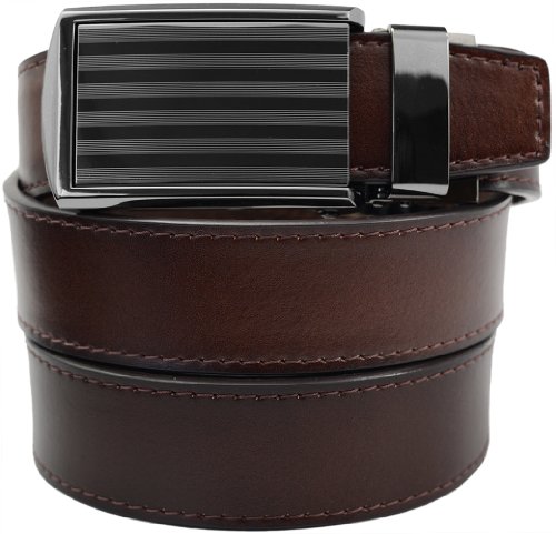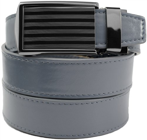 - Feature : Genuine leather micro-adjustable belts without holes. Our ratchet belt system ensures that you always get a precise fit. / Trim-to-fit Belt Strap. Fits up to a 48" Waist Size. Easy to customize to your exact waist size and incredibly comfortable to wear. / Unique, removable ratchet belt buckles allow you to smoothly and subtly adjust between belt size adjustments. / Sleek, classy belt buckle styles make your belt suitable for all occasions. / Leather straps are 1-1/4" (3.2 cm) wide. Buckles are 1-5/8" (4 cm) wide x 3-1/2" (9 cm) long.