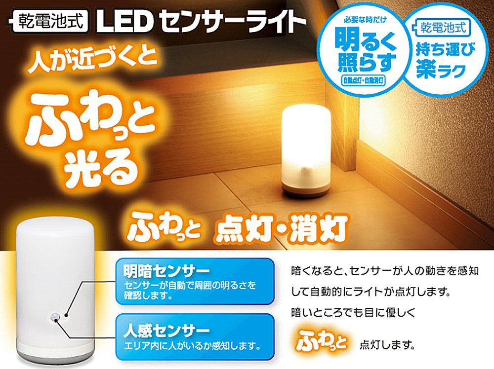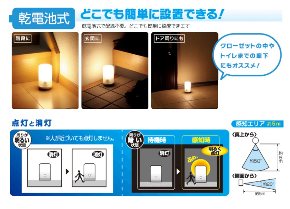 <BR> Because dry battery type wiring is unnecessary, it is easy to set it anywhere! <BR> Ideal for lighting such as indoor shoebox or bedroom, paid door, closet, staircase, etc. <BR> Return from home while at night