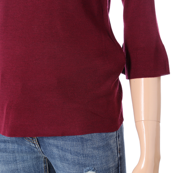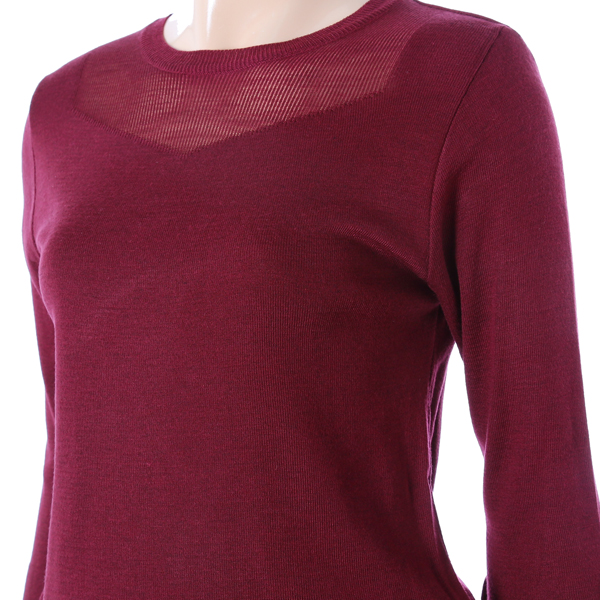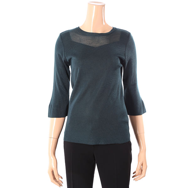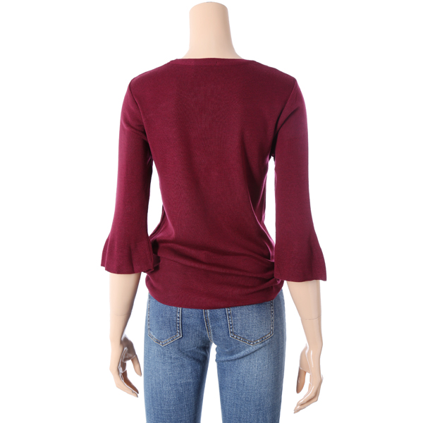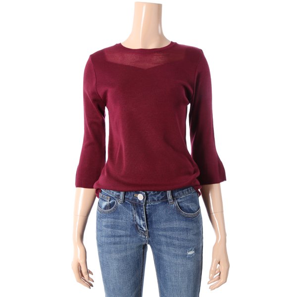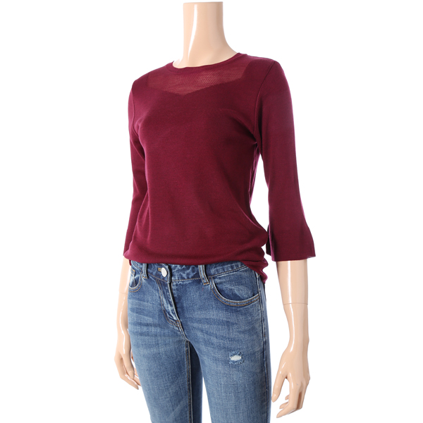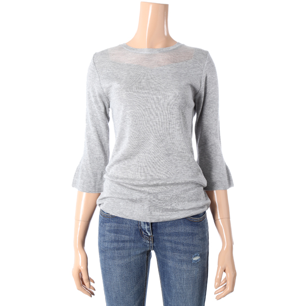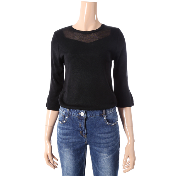소매끝이 나팔처럼 살짝 벌어지고 목선아래쪽이 시스루로 여성스런 스타일의 니트티셔츠입니다~