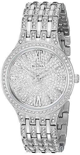 New slim dress styling in stainless steel embellished with 440 Swarovski Crystals on bracelet, bezel and full-pave dial, deploy ant closure, and water resistance to 30 meters