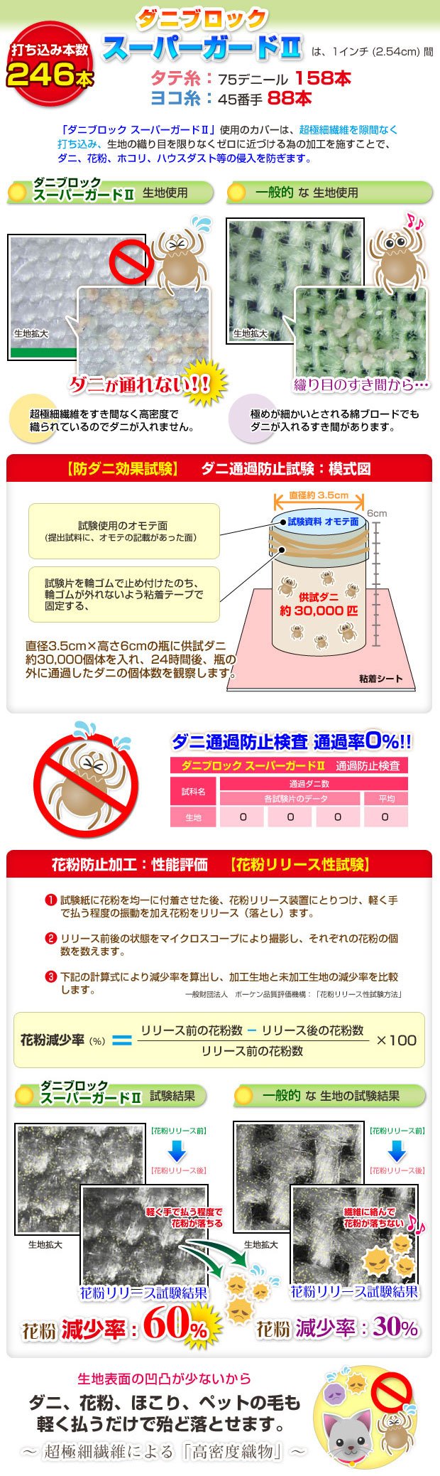 The tick prevention effect does not wane even if it is washed in the washing test, mite, pollen, house dust attached to the surface also falls easily by washing, it is also popular for people with mite control measures, hay fever and allergies.