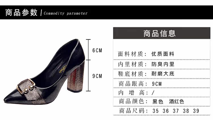 尖头高跟鞋单鞋女新款百搭韩版时尚浅口金属扣女鞋粗跟鞋子