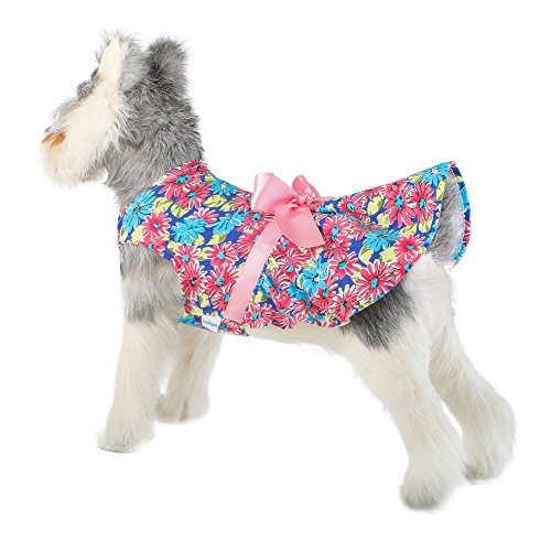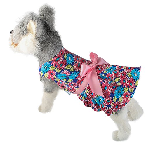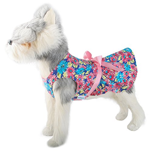 Exquisite craftsmanship with attention to detail, yet doesn't break the bank. Soft, quality fabric with an inside layer of grenadine that helps your dog breathe and stay cool. Slightly flared skirt and ribbon define the waist. Designed and fitted for small to medium sized dogs.