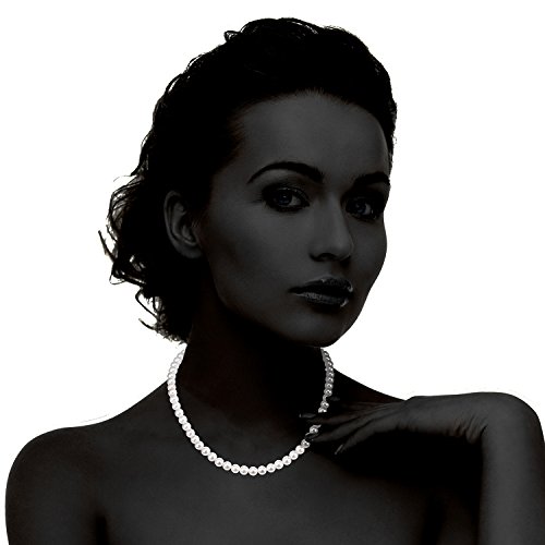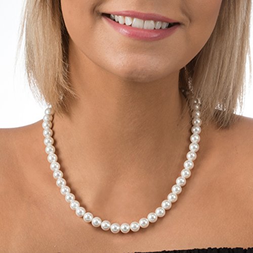 Fashion necklace is 18" Princess length - the gold standard of pearl strand lengths. Simulated Shell PEARL NECKLACE strand is knotted with a Rhodium Plated 925 Sterling Silver Clasp.