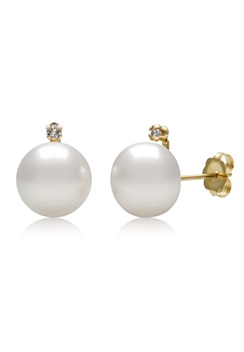 Adorn yourself in the simplistic elegance of these classic diamond top stud earrings featuring white 9.0-9.5mm button-shaped genuine cultured freshwater pearls set in 14kt yellow gold. With a design simple enough to wear over and over again, these versatile earrings are sure to become a staple in your jewelry collection. These pearl stud earrings pair seamlessly with everything from your favorite dress to a casual button-front shirt and jeans, making them the perfect gift for yourself or a loved one. Each pearl may have slight variations in color, shape, and size due to natural pearl formation process.Feature