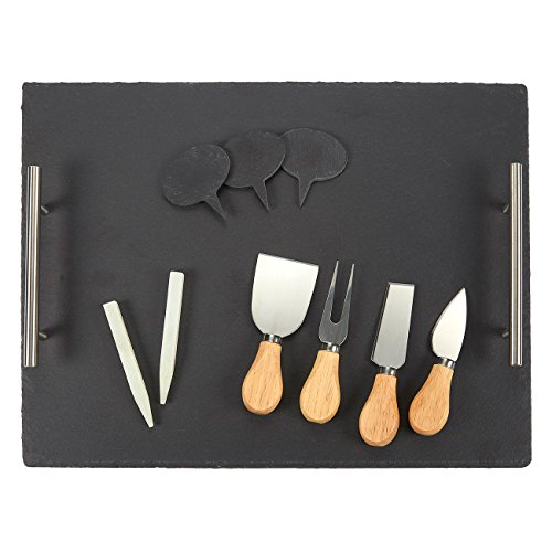 QUALITY SLATE CHEESEBOARD WITH KNIVES: This rustic-style set includes 1 slate board with 2 handles, 3 wooden handle Stainless Steel cheese knives, 1 wooden serving fork, 3 mini slate cheese labels, and 2 chalk pens