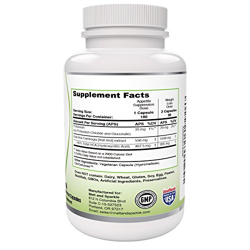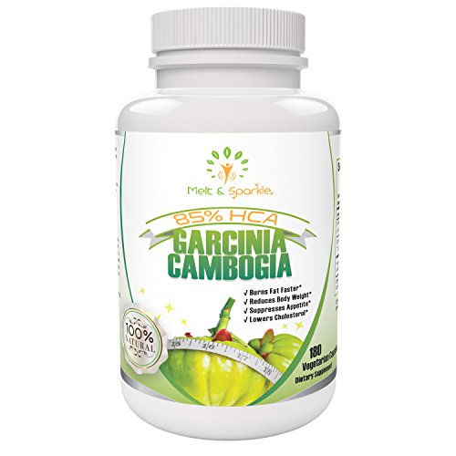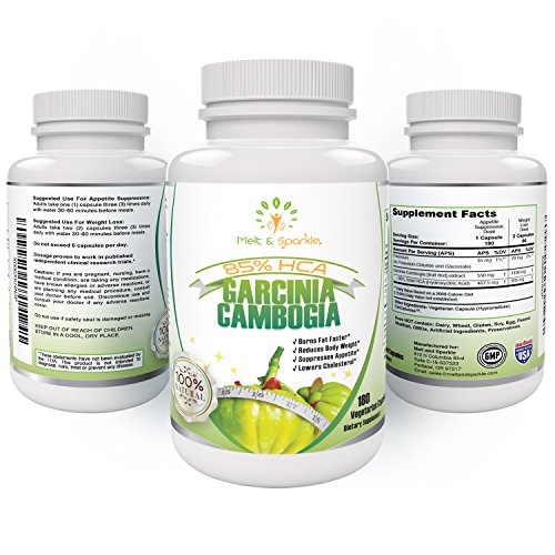 -. Binding : Health and Beauty -. Brand : Melt and Sparkle -. Color : White -. EAN : 0646437419727 -. Feature : MONEY BACK GUARANTEE - Your satisfaction is very important to us - If you are not 100% happy, we guarantee we will promptly refund your money. / SCIENTIFICALLY PROVEN SAFE AND NATURAL WEIGHT LOSS - Most products on the market provide low dose HCA - 2 capsules of Melt and Sparkle taken 3 times daily actually provides the same dose of HCA (2800 mg/day) shown to cause a 5% reduction in body weight & body mass index after 8 weeks in Dr Preuss's Human Trials- Works equally well in women and men. / MADE IN USA ALL NATURAL GARCINIA CAMBOGIA - Ultrastrength 85% HCA Extract - 180 easy to swallow vegetarian friendly capsules - No artificial ingredients or preservatives - No GMOs - No Dairy - No Gluten - No Wheat. / CHOICE BETWEEN 2 DOSES - Appetite suppression dose (1 capsule three times daily) for slower weight loss and Weight loss dose (2 capsules three times daily) for more rapid weight loss. / REDUCES YOUR CRAVINGS - Fruit-derived HCA suppresses your appetite naturally -. IsAdultProduct : 0 -. Label : PLS -. Manufacturer : PLS -. PackageQuantity : 1 -. ProductGroup : Health and Beauty -. ProductTypeName : HEALTH_PERSONAL_CARE -. Publisher : PLS -. Size : 4.75" tall, 2.75" diameter -. Studio : PLS -. Title : Garcinia Cambogia 85% HCA ULTRA STRENGTH -100% NATURAL Extract-WEIGHT LOSS Supplement -. UPC : 646437419727