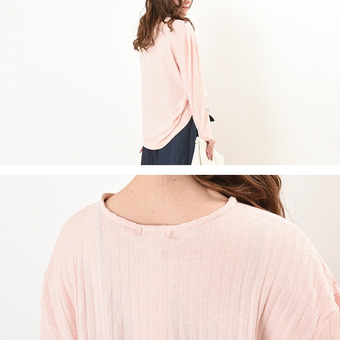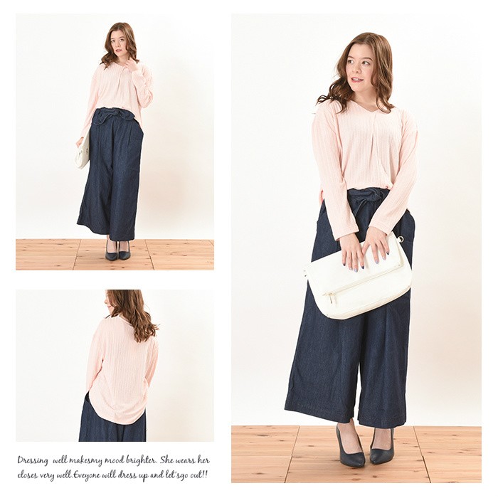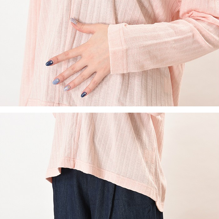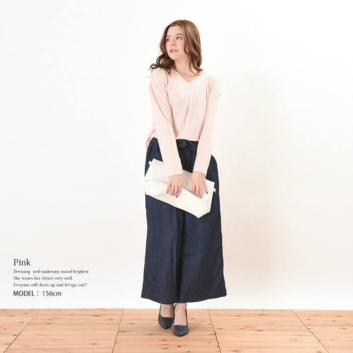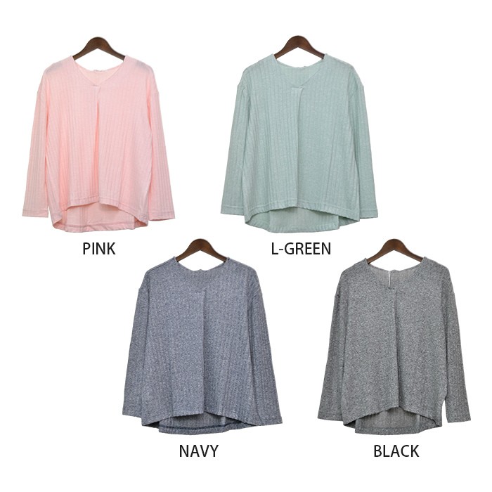 無地でシンプルかつ、立体感のある生地でオシャレな雰囲気がありコーディネートに取り入れやすく着回ししやすいデザインです♪人気のVネックは首回りがすっきりと見えるので、着やせ効果抜群え幅広い年齢層の方に大人気です♪伸縮性たっぷりの生地感で着心地楽ちんなので、普段使いにピッタリでワードローブにお使いいただけます。Mサイズ Lサイズ