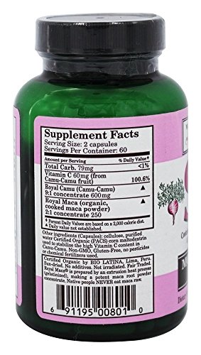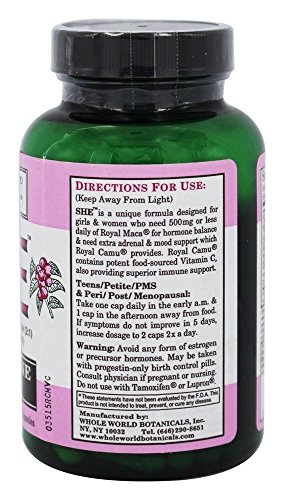 Studio : Whole World Botanicals Publisher : Whole World Botanicals Binding : Health and Beauty Product Description SHE is a unique formula designed for girls women who need 500 mg or less daily of Royal Maca for hormone balance need extra adrenal and mood support which Royal Camu provides. Royal Camu contains potent food-sourced Vitamin C, also providing superior immune support. 0