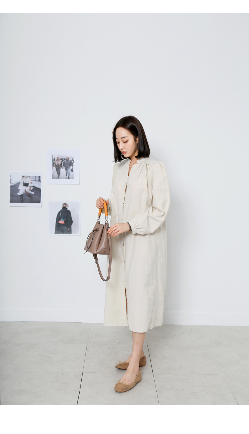 모리 겉기모 셔링 롱 셔츠원피스여성스러운 퍼프 소매 겉기모 셔링 롱 셔츠원피스 코튼 100%의 톡톡한 소재에 겉기모로 소프한 터치감이 좋은 롱 셔츠 원피스에요 소매와 뒷라인에 셔링을 넣어 넉넉한 품이 편안한 핏으로 프렌치 감성의 셔링 장식이 예쁜 원피스랍니다 넉넉한 핏과 여성스러운 디테일의 아이템으로 원피스로 루즈하게 툭 걸쳐입는 아우터로도 활용도 높은 아이템이에요 Color아이보리, 그레이, 브라운 SizeFREE (44~66반) Fitting아이보리, 그레이 ModelMJ. 166cm . 55size Codyitem떼로 브이넥 언발 니트베스트 싱글 포켓 배기 팬츠 앙고라 울 여리핏 반팔티 Notice드라이클리닝, 건조기 사용금지 |