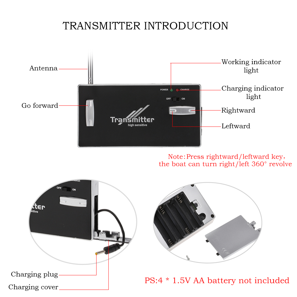 Battery for transmitter: 4 * 1.5V AA battery (not included)