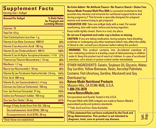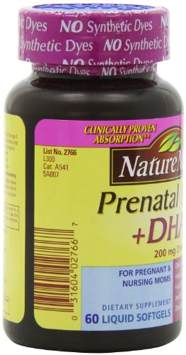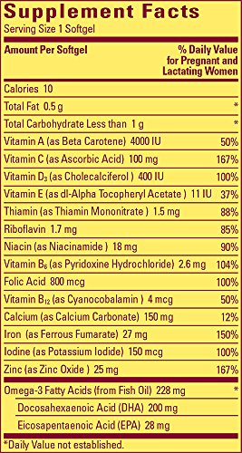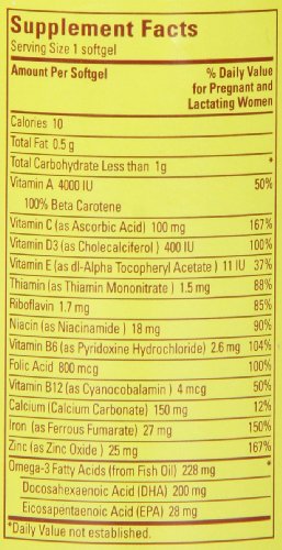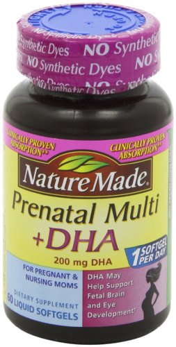 Nature Made Prenatal Multi + DHA combines the key nutrients of a prenatal multivitamin with 200 mg of omega-3 fatty acid DHA into one softgel.