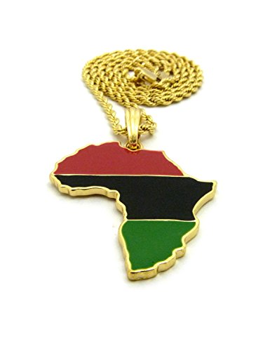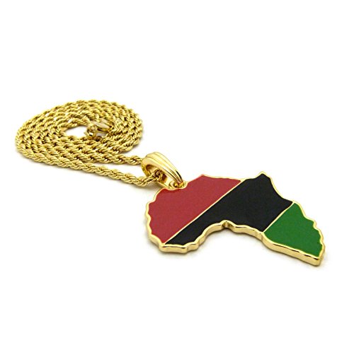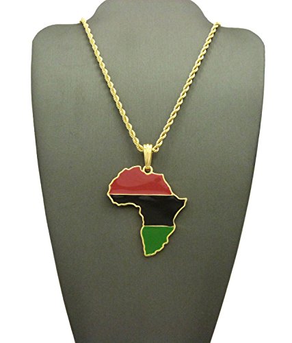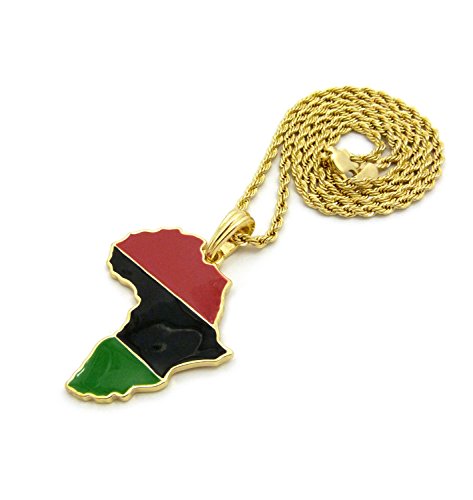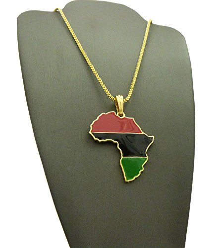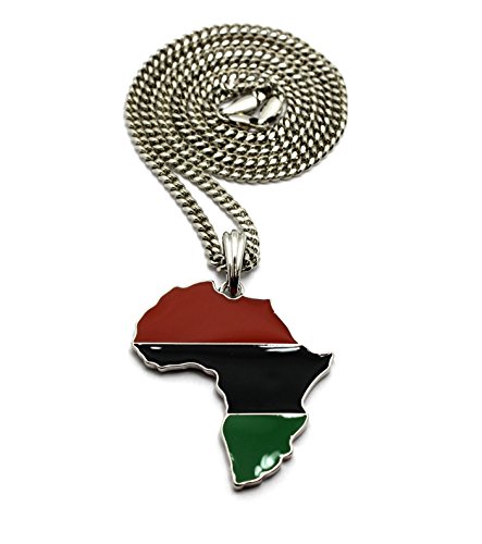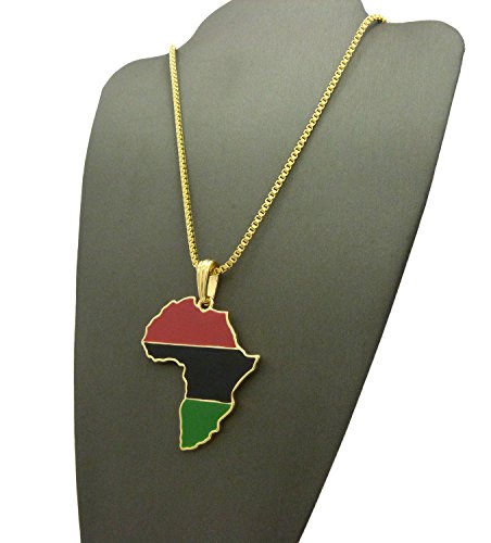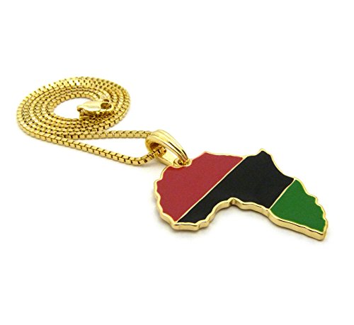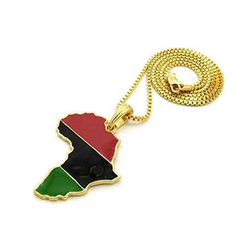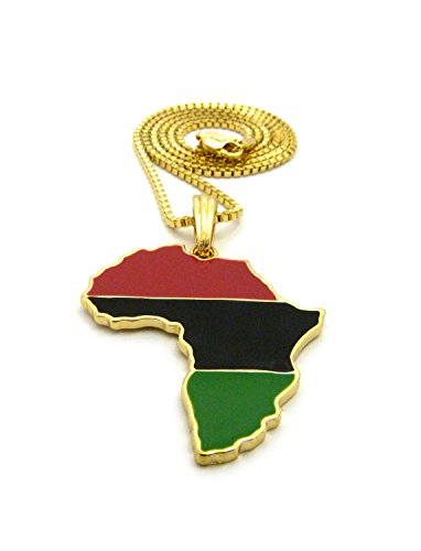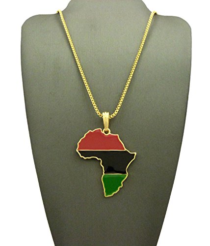 -. Feature : Pan African Colored Africa Map Pendant 24" Various Chain Necklace in Gold, Silver Tone / Size of Pendant : 1.55" x 2.25" / Chain: 2mm 24" Box Chain, 3mm 24" Cuban Chain, 2mm 24" Rope Chain / Imitation Gold, Silver Tone Plated / (Fashion Costume Jewelry)