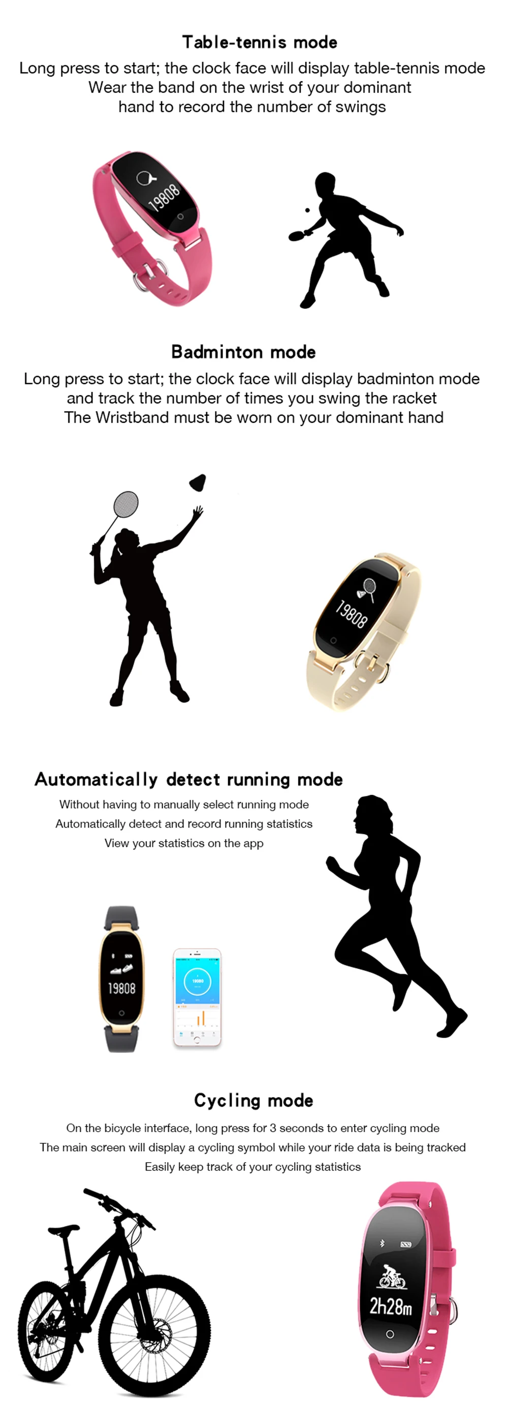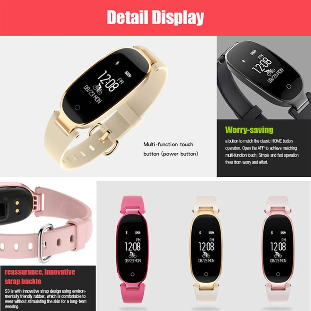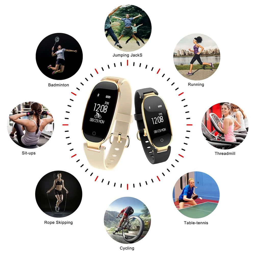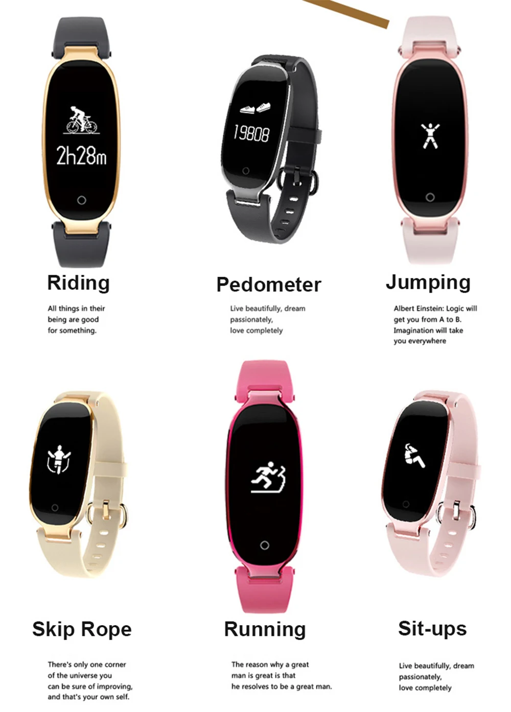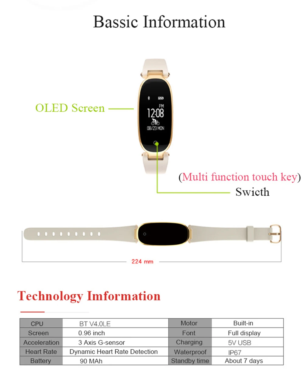 Function:Passometer,Sleep Tracker,Power Reserve,Push Message,Heart Rate Tracker,Alarm Clock,Remote Control,Month,24 hour instruction,Fitness Tracker,Message Reminder,Week,Call Reminder