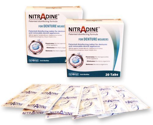 -. Feature : Patented disinfecting tablet for cleaning dentures and other removable dental appliances. / Buy nitradine denture seniors to clean & disinfect : acrylic dentures & plates, metal chrome dentures, flexible dentures & other dental appliances / Works effectively after only 15 minutes on all types of removable dental appliances. / Recommended dosage : one tablet two times per week. / Two boxes supplied each containing 20 tablets