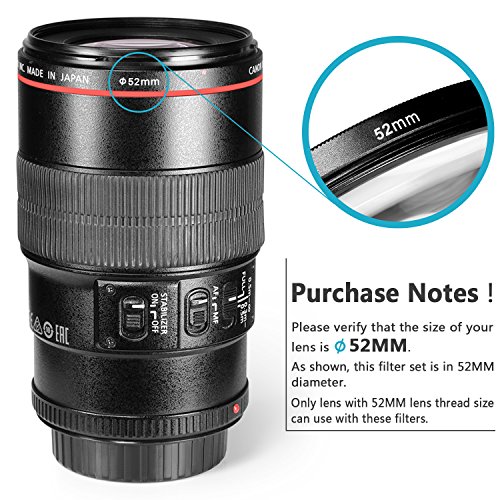 Note: 1.The Lens NOT INCLUDED 2.This neutral density filter set is compatible with all 52mm lenses. Please verify your camera's lens thread size before ordering.