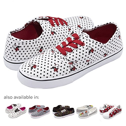 -. Feature : JOIN THE CRAZE: Featuring the iconic Mickey and Minnie designs, these low top cut sneakers with lace let you show off your love for your favorite Disney character in a fashion-forward style / WALK WITH COMFORT: Featuring a round toe, a cushioned footbed, and a rubber sole, you'll enjoy strolling while feeling comfortable wearing these shoes all day long! / VERSATILITY AT ITS FINEST: Dressing up for a party, a Saturday lunch out, or a shopping day? Pump up your outfit with these Mickey and Minnie sneakers! These shoes go well with a skirt, a dress, shorts, or pants. Ready for anything! / DURABLE CHARM: Made of durable and long-wearing canvas construction so you can enjoy these for many occasions to come / EASY WEAR, EASY CARE: These low top sneakers are easy to slip on and offer a secured fit. Each pair is easy to wipe for quick cleaning, making it ideal for girls who are always on the go!