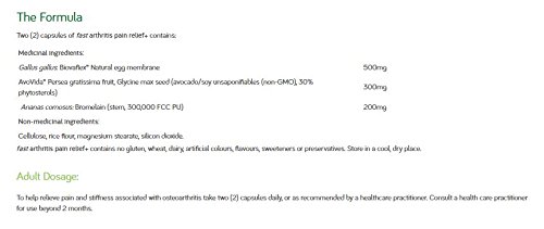 -. Feature : Increased range of motion joint mobility & joint space lost of arthritis / Helps build joint cartilage and provide important nutrients for joint repair / Natural anti-inflammatory, providing more support for this common component of joint pain / Helps in relieving pain due to arthritis in as little as 5 days (compared to 10-30 days for Glucosamine) About the robust ingredients found in fast arthritis pain relief+: • AvoVida® Research-proven to increase joint space lost from degenerative changes in osteoarthritis. • Bromelain a natural enzyme found in pineapples, which is highly anti-inflammatory and provides superior support for common components of joint pain, and highly problematic symp of arthritis. / Derived from egg shells, Biovaflex® natural egg membrane feeds your body all essential nutrients for proper joint health and flexibility, including glucosamine, chondroitin sulfate, collagen, elastin and other proteins. When taken daily, fast arthritis pain relief+ prevents and treats joint pain, while providing cartilage building and reducing inflammatory markers like C Reactive protein.