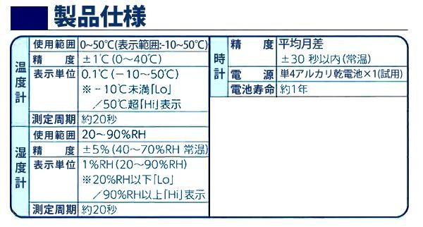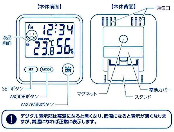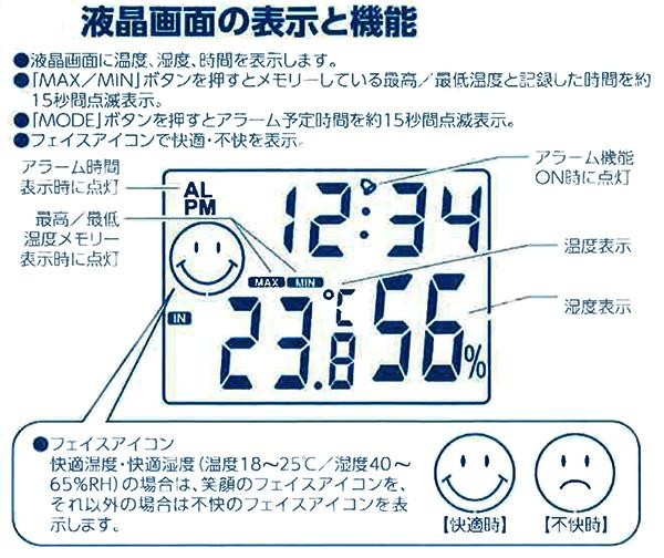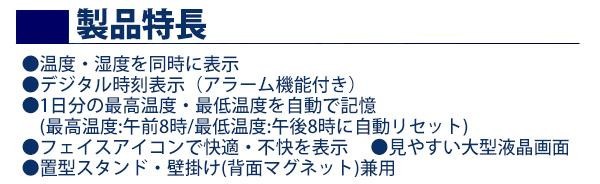 液晶のフェイスアイコンが、表情で快適と不快をお知らせする温度・湿度計時計。1日の最高・最低温度メモリー表示機能や、デジタル時刻表示機能付きです。背面マグネットでスチール面にピタッと貼り付け♪ |
