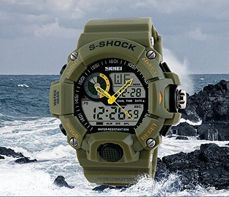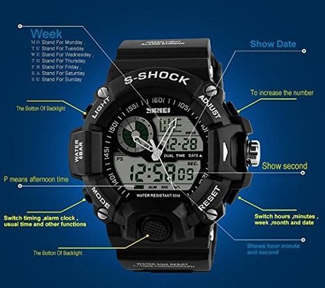 Japanese High quality movement. Long Battery Life Display time in numbers indicate the hour, minutes and seconds, Display the day & date 12h/24h, Alarm clock function included, Stop watch function included .