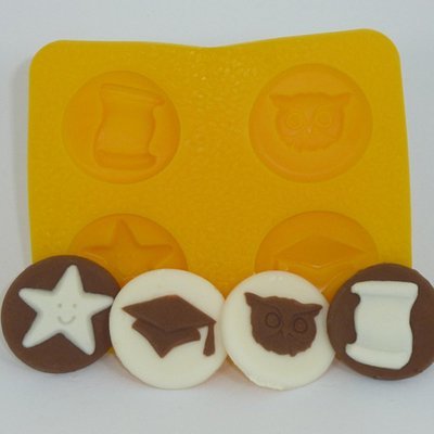- Flat disc with raised design: owl, smile star, diploma, graduation hat