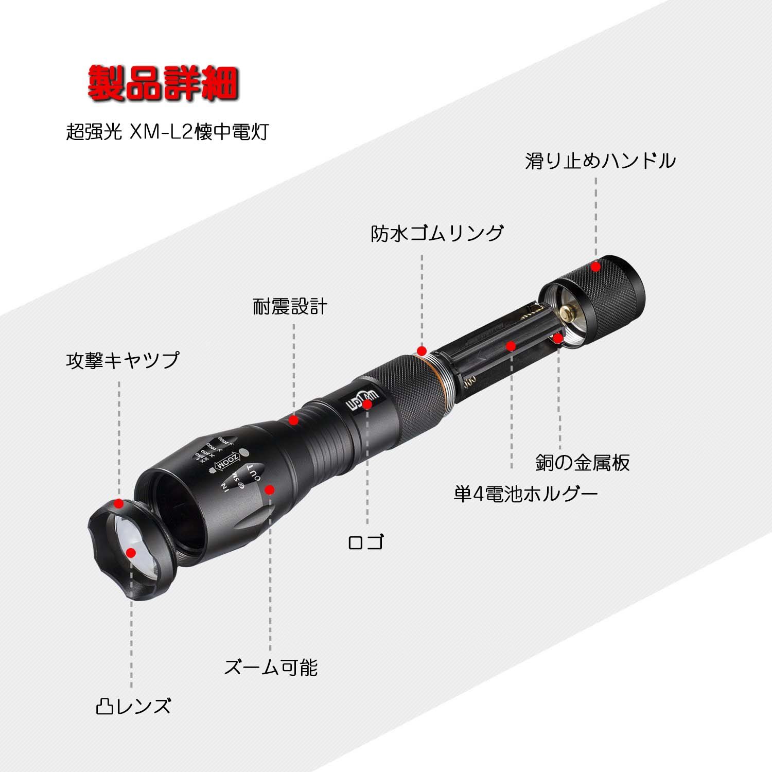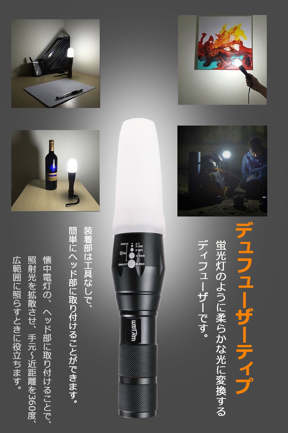 By attaching it to the head part of the flashlight, it diffuses the irradiation light and it is useful for broad range illumination from hand to close range 360 degrees.