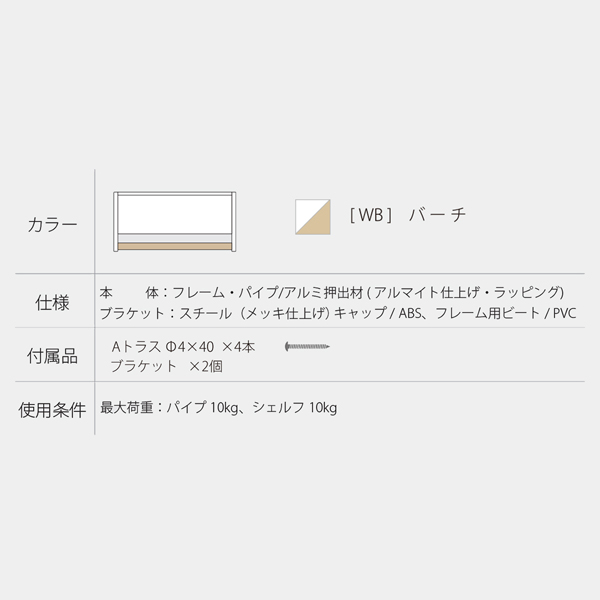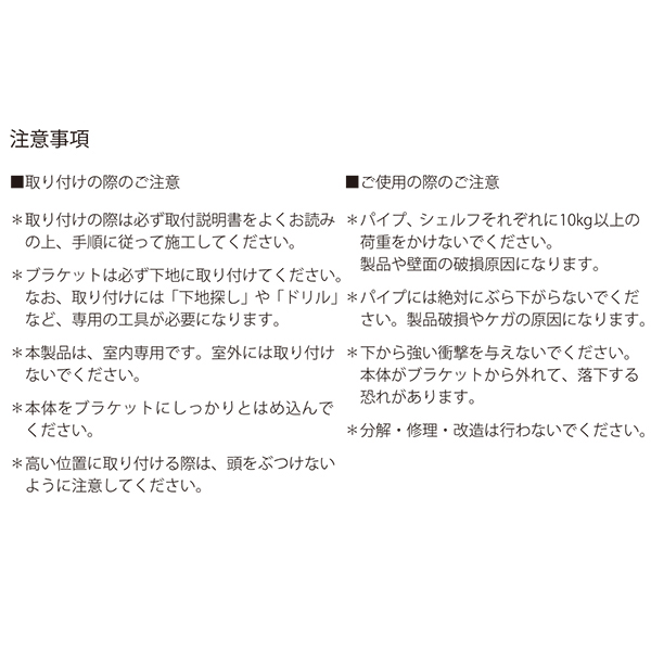 ●パイプ・シェルフそれぞれに10kg以上の荷重はかけないで下さい。