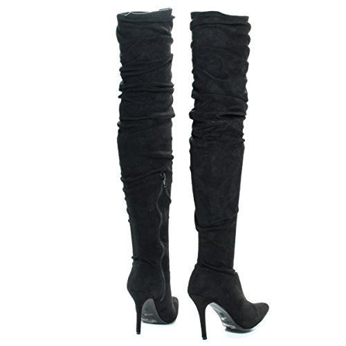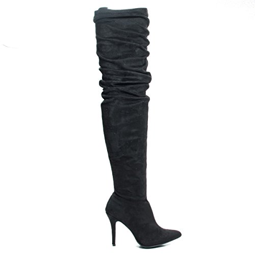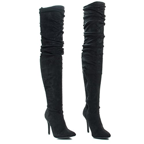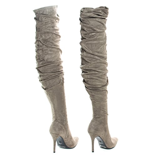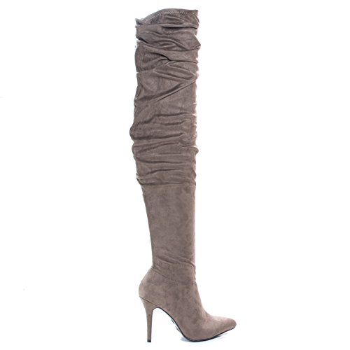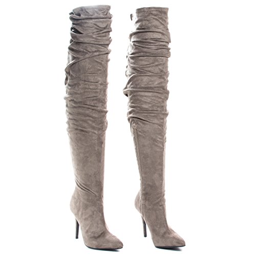 Binding : Apparel Product Description This beautifully sculpted over the knee; thigh-high boots features a thin, 4 inches high stiletto heel, 23 inches high shaft with purposely wrinkled upper shaft. The thigh opening is quit thin at only 14 inches wide at the very top, make sure to carefully measure your thigh circumference before placing your order. (Please note that these measurements are based on a size 7). Style fits true to size. Available in Taupe (gray), Black etc. All man made materials. Why buy expensive brand name shoes when you can get inexpensive alternative, with this style you can afford to have beautiful styles without compromising the quality or the price. By Anne Michelle 0