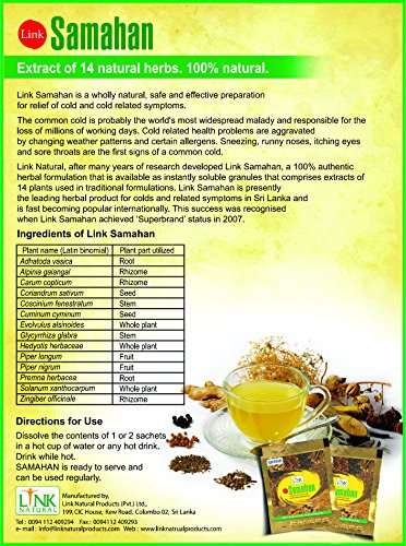 -. Feature : Samahan could be used for up to 2 years from purchase as we ship fresh product directly from Sri Lanka. / Samahan is a concentrated, water soluble preparation of selected medicinal plants used over centuries in Ceylon. / Samahan consists of fourteen different herbal ingredients, some of which are spices, and condiments. / Samahan is effective in providing rapid relief to the symp of common cold, cough, headaches, body aches and other catarrh related ailments. / Dru Era do not hold stocks overseas and have been shipping our products worldwide for over 10 years directly from Sri Lanka.