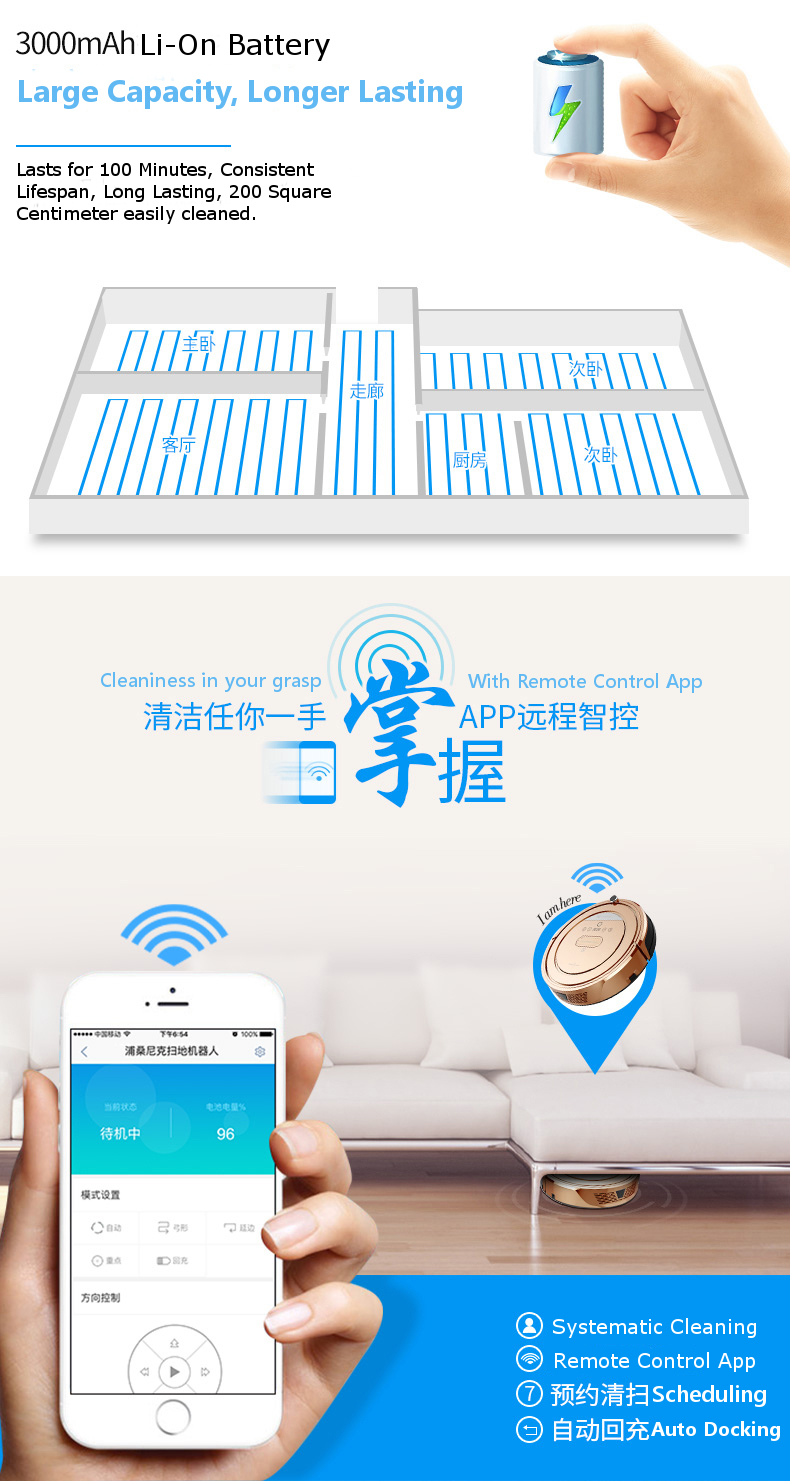 - 3 Modes of Suction Power cleaning, ECO, NORMAL and TURBO mode available in APP setting. Activate 1800PA TURBO suction mode for a truly Deep Clean. (Currently this function is only shared with the latest iRobot Room ba 980 and Neato Botvac Connected Models!!).