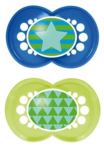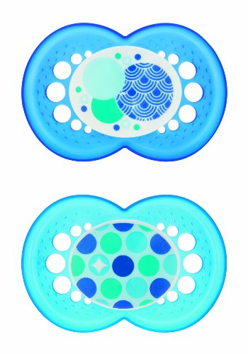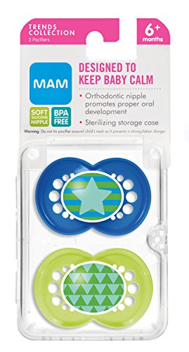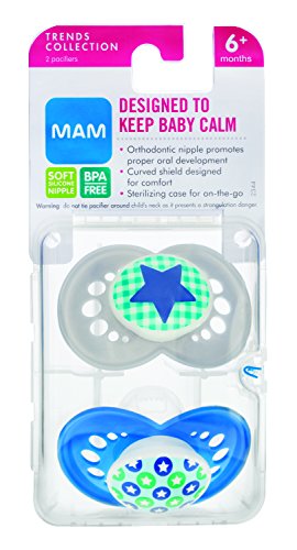 -. Binding : Baby Product -. Brand : MAM -. Color : Blue -. Department : baby-boys -. EAN : 0885489096016 -. Feature : Two BPA-free pacifiers / Curved shield allows the pacifier to sit comfortably on baby's face / MAM Ultra Soft Silicone Nipple stays comfortably in baby's mouth due to the anti-slip texture / Symmetrical nipple ideal for baby's jaw development / Textured surface and multiple small openings on the pacifier shield allow air to circulate and baby's skin to breathe -. IsAdultProduct : 0 -. Label : MAM -. Manufacturer : MAM -. Model : 2744-012-0-1 -. MPN : 2744-012-0-1 -. PackageQuantity : 1 -. PartNumber : 2744-012-0-1 -. ProductGroup : Baby Product -. ProductTypeName : BABY_PRODUCT -. Publisher : MAM -. ReleaseDate : 2015-02-10 -. Size : 6 Plus Months -. Studio : MAM -. Title : MAM Trends Silicone Orthodontic Pacifier, Boy, 6+ Months, 2-Count -. UPC : 885489096016